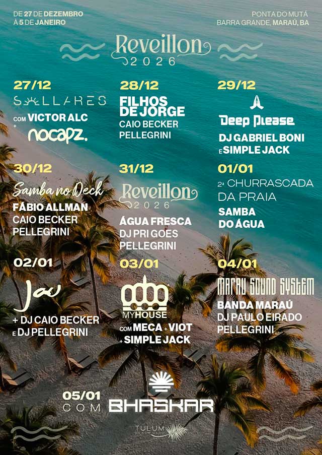A terra da magia, abre os braços mais uma vez para receber todos com muita música e alta gastronomia com pé na areia. Barra Grande, será palco do 6º ano do réveillon prestigiado, alto astral, sofisticado e delicioso da região. Com muito conforto em um ambiente muito bem decorado, onde a natureza é exuberante, com vista de tirar o fôlego, grandes artistas irão se apresentar em festas intimistas...