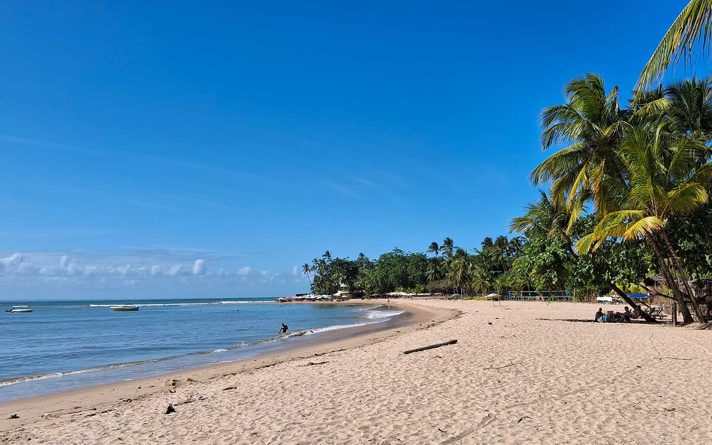 É uma praia de mar aberto, com ondas fortes, areia grossa e clara e coqueirais. Possui hotéis e pousadas e casas para temporada. Muito extensa, a praia é marcada pela presença de recifes que surgem da água na maré baixa, formando piscinas naturais. É o início de uma sucessão de longas praias interligadas que vai até a praia do Pontal, em Itacaré, a 50km ao sul.